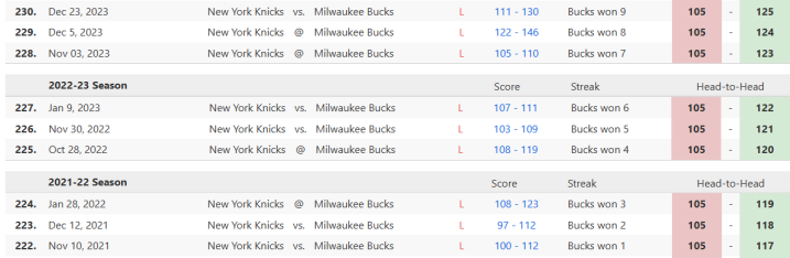 尼克斯21年至23年面对雄鹿一度遭遇9连败,24年至26年面对雄鹿拿到7胜1负。